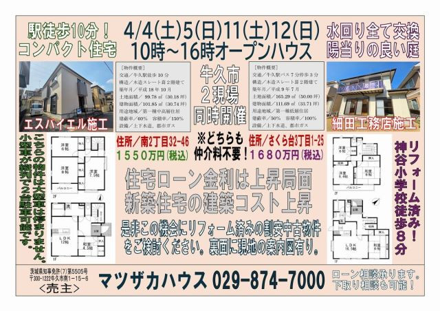牛久市内 中古戸建 2現場同時オープンハウス開催! リフォーム済み優良中古戸建 2現場同時オープンハウス開催! 今週と来週の土日。2週連続! ※駅徒歩10分! (南2丁目)1550万円 ※水回り全て交換済み!(さくら台3丁目)1680万円 詳細は下記参照 記事の更新日:2026/04/03